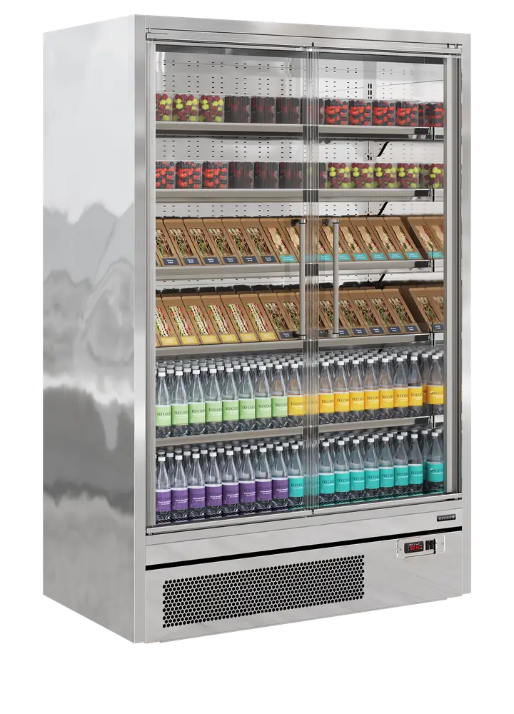 The TEFCOLD Galaxy+ FGD (Full Glass Door) range, finished in mirror stainless steel: our latest innovation in plug-in multidecks. We’ve combined an expanded display area and optimised cabinet efficiency with frameless, full-vision glass doors, offering enhanced product visibility that captures customers’ attention. The ultra-low front and slim top canopy provide an extra 100mm of internal height, accommodating up to 5 shelves (plus base) as standard. With a depth of only 740mm, the unit fits through standard doors for easy installation, yet has 400mm deep shelves for maximum stock capacity. Thanks to the carefully designed refrigeration system and optimal airflow throughout the cabinets, all sizes in this range are rated B for energy efficiency. Each unit comes with heavy-duty adjustable shelves that can be tilted if needed, EPOS ticket strips and shelf risers as standard. Optional extras include glass end-walls and multiplexing kits.