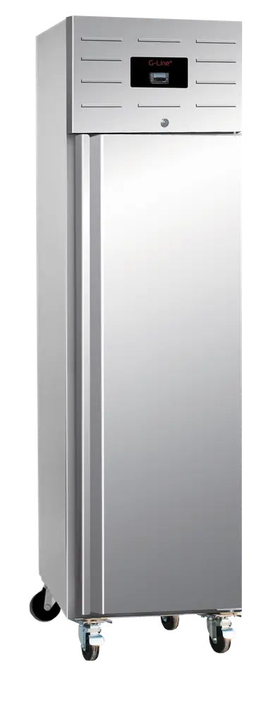 The G-line slim upright chiller is designed for busy kitchen environments. It has strong wheels for flexibility and a stainless steel exterior for high durability. It has adjustable shelving and accepts GN1/1 gastronorm pans. A great value-for-money product.