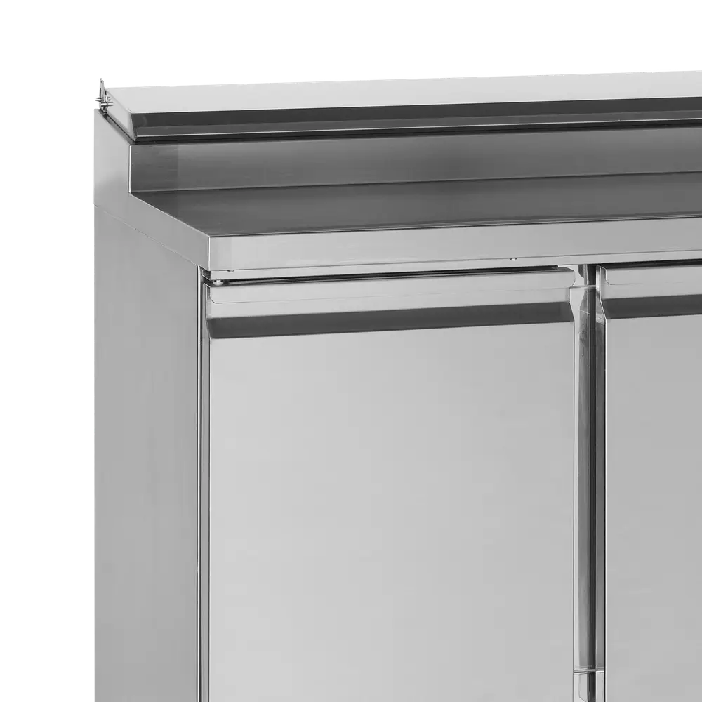 Gastronorm saladette counter for professional kitchens. The G-line saladette counters provide outstanding value, perfect for bustling kitchens. With 1/1 gastronorm cupboards and adjustable shelves, it ensures efficient operations. The well accommodates 1/6, 1/3, and 1/9 size gastronorm pans up to 150mm deep. Its cooling system is placed below, making the unit space-efficient—ideal for smaller kitchens too.